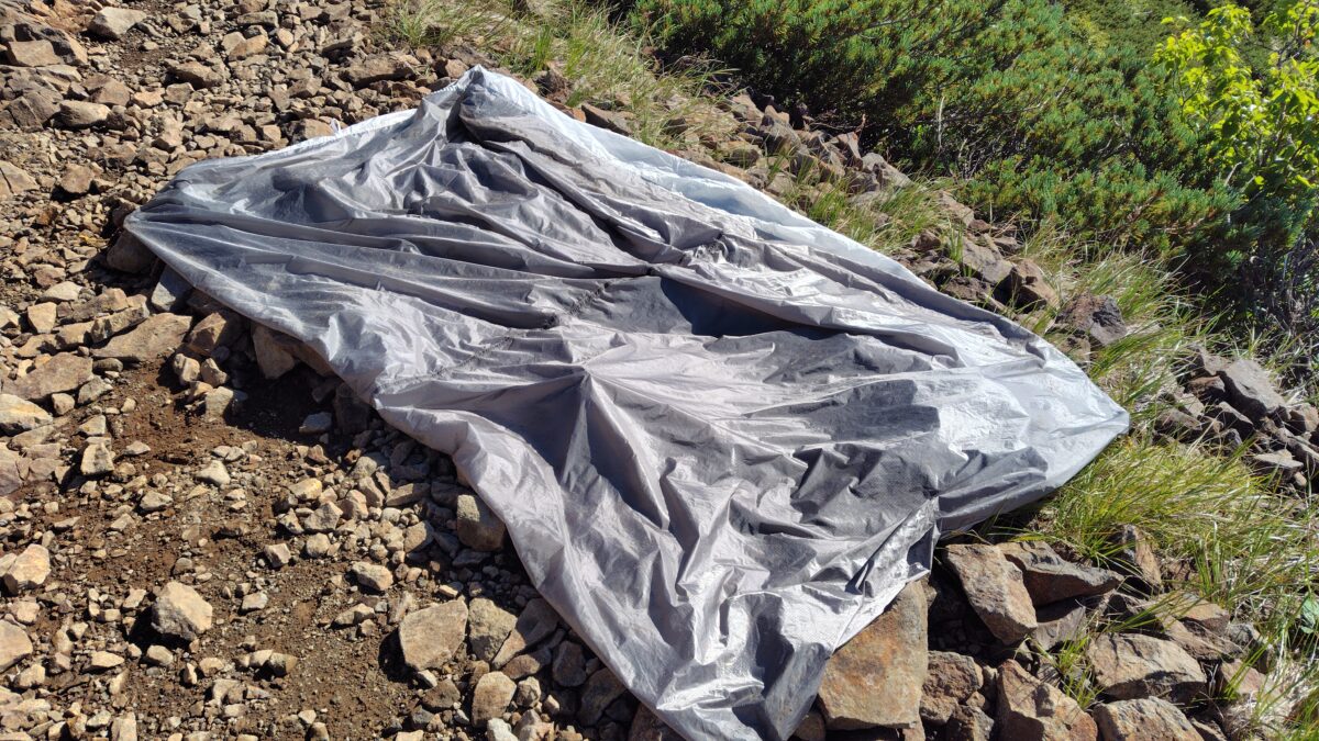 休憩している間に、びしょびしょのままザックに突っ込んだテントを出して乾かしました。日光パワーはすごいもので、ほんの10分ほどでほとんど乾いてしまいました。