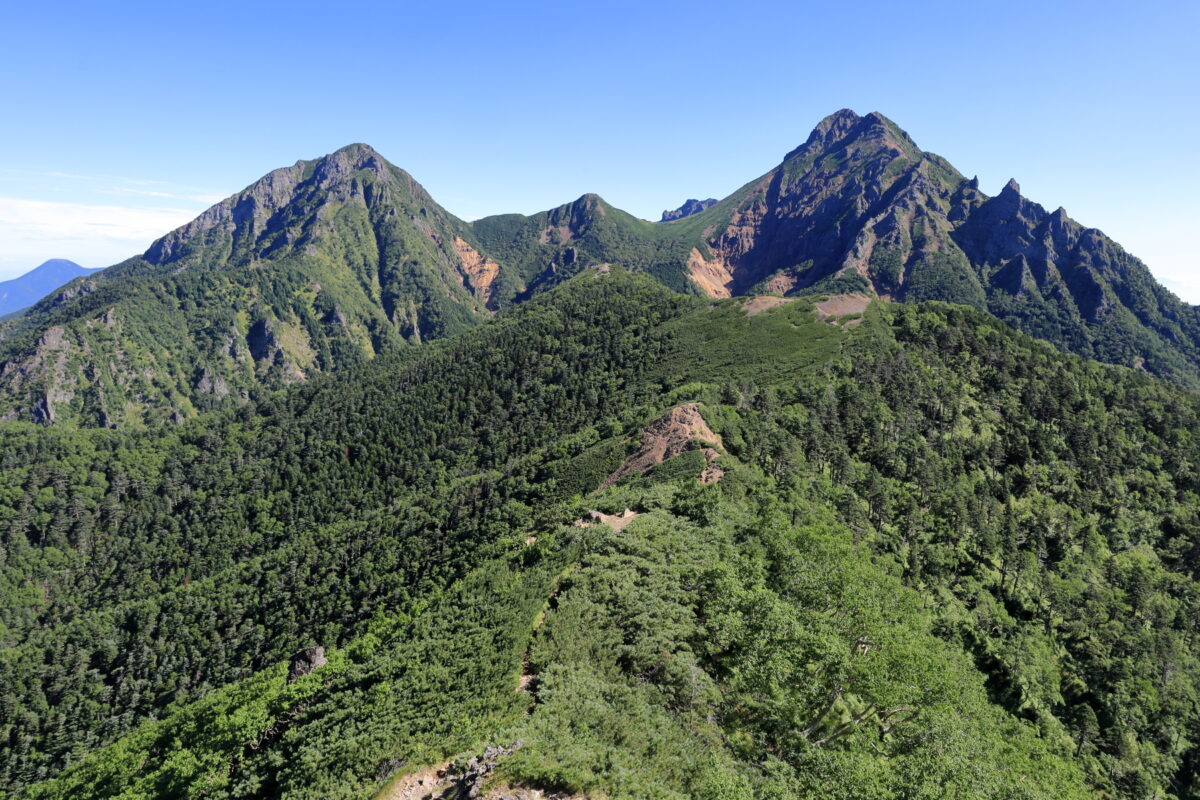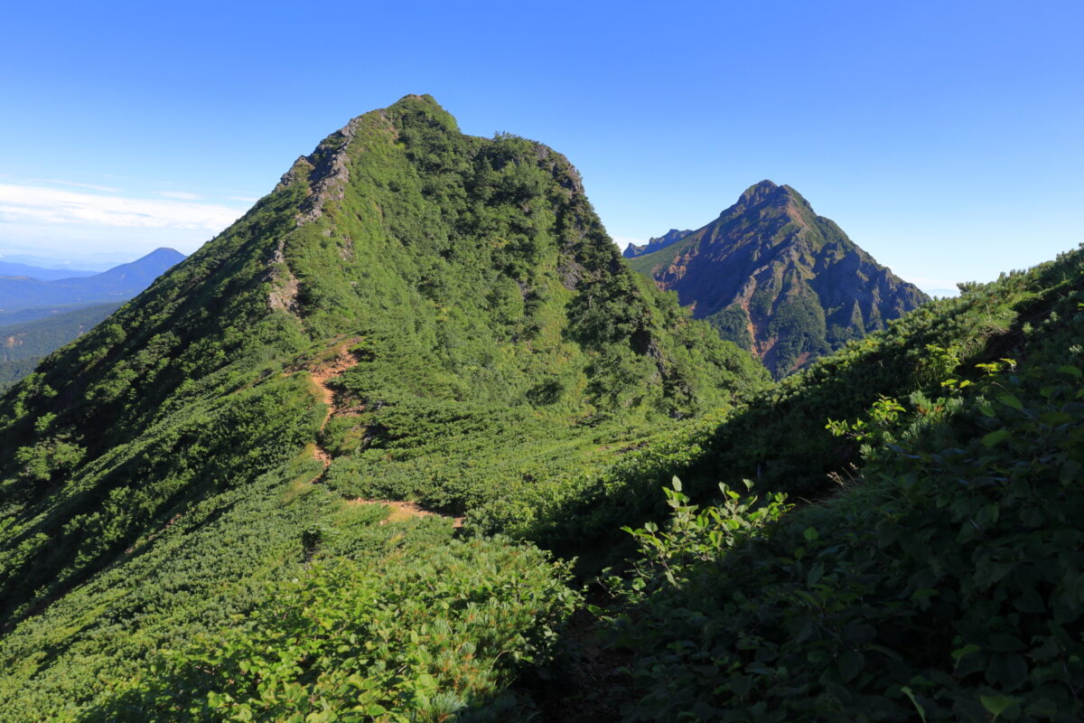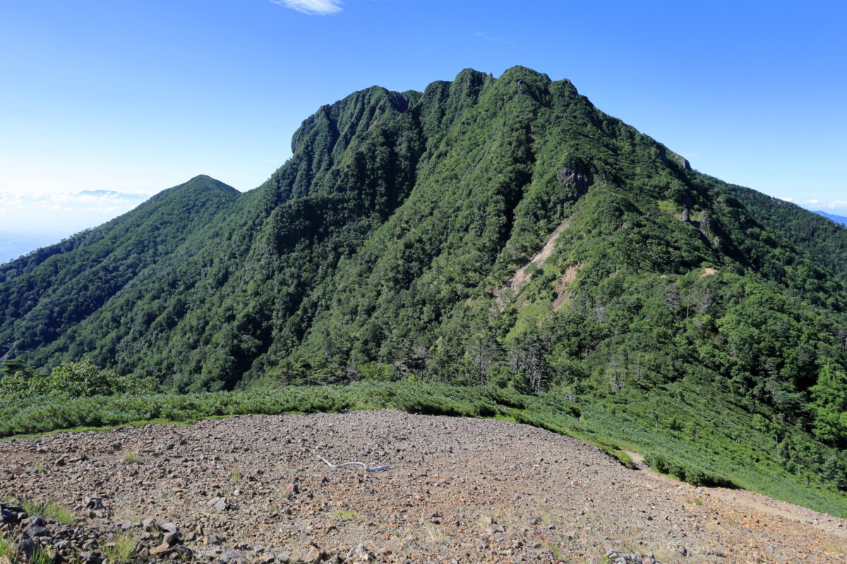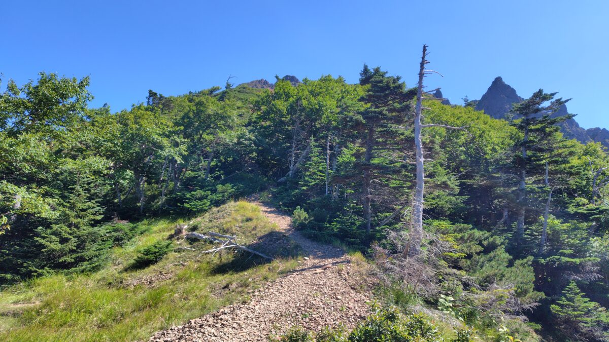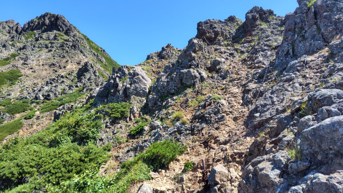 少し登ったところで振り返ると、ここまで歩いてきた道が見えました。左奥の権現岳から、右下へ、旭岳、ツルネを超えてここまで。こう見ると穏やかな道に見えますが、あちこちに急坂があって、結構しんどい道です。
