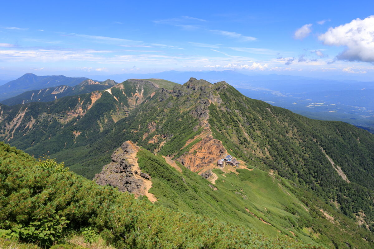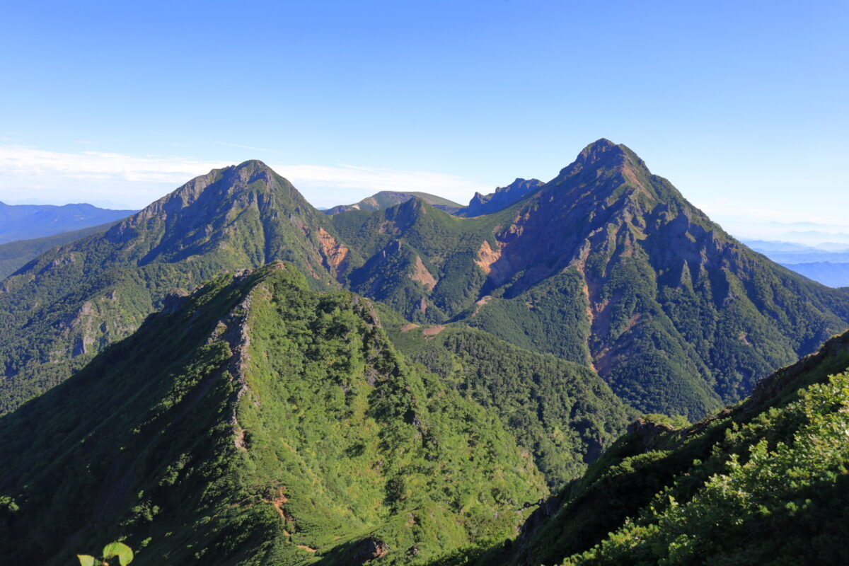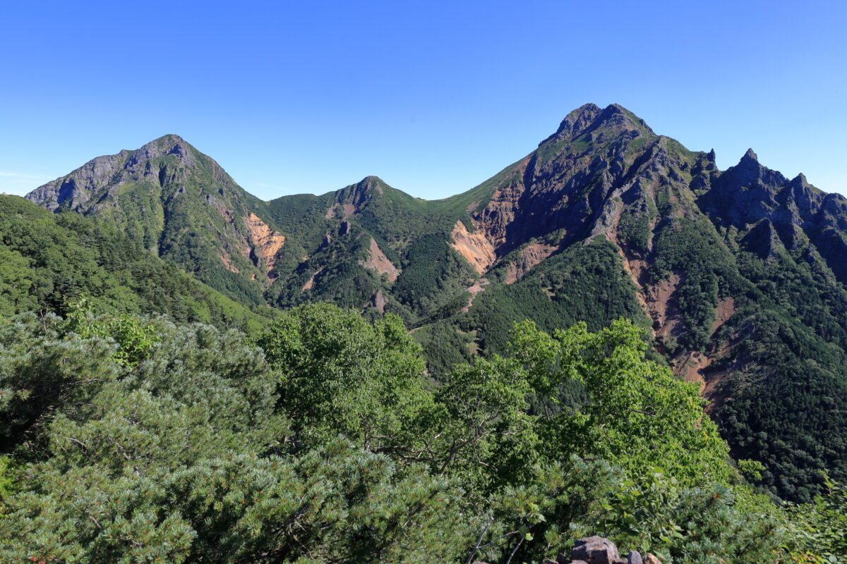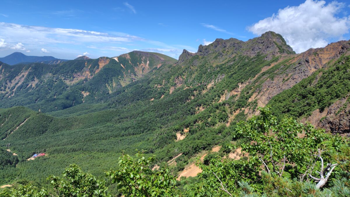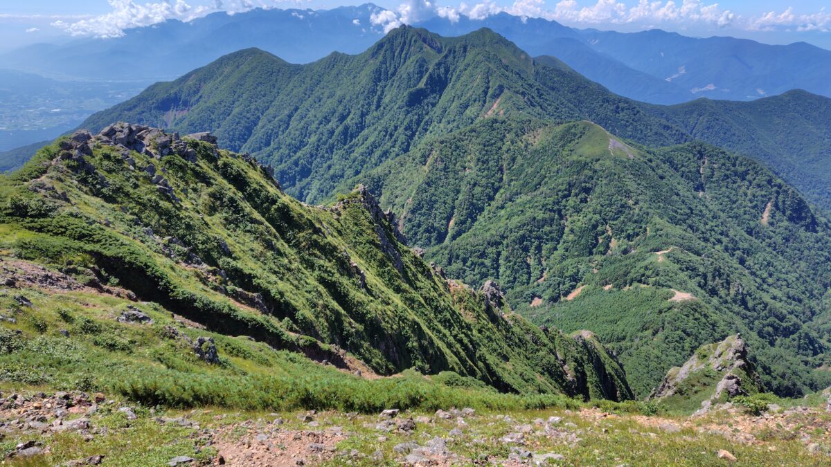 少し登ったところで振り返ると、ここまで歩いてきた道が見えました。左奥の権現岳から、右下へ、旭岳、ツルネを超えてここまで。こう見ると穏やかな道に見えますが、あちこちに急坂があって、結構しんどい道です。