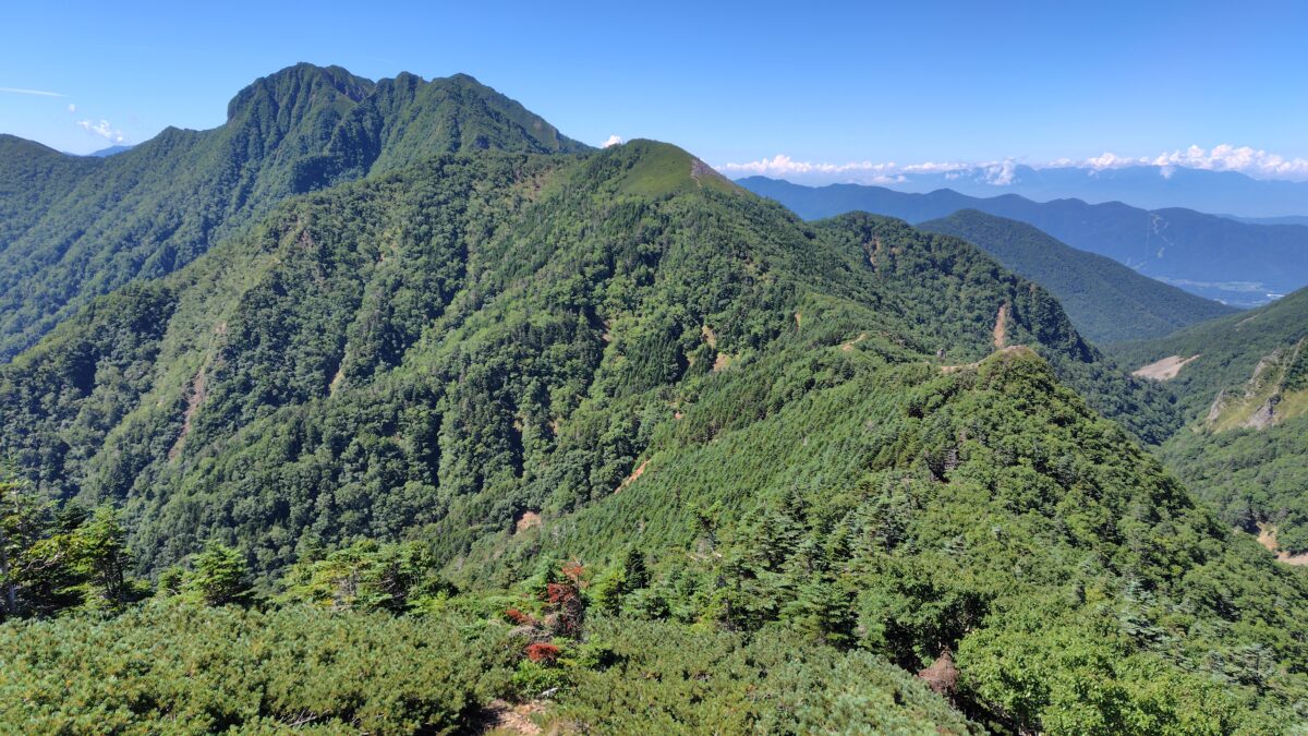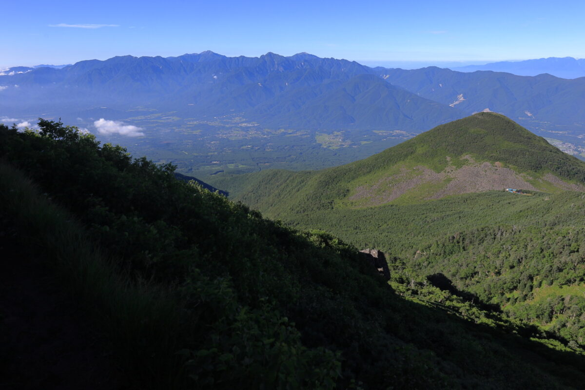 振り返って見ると、ずいぶん登ってきたことがわかります。権現岳と同じくらいの高さまで登ってきたかな? 奥には南アルプスもくっきりと見えて、とても良い眺めですね。
