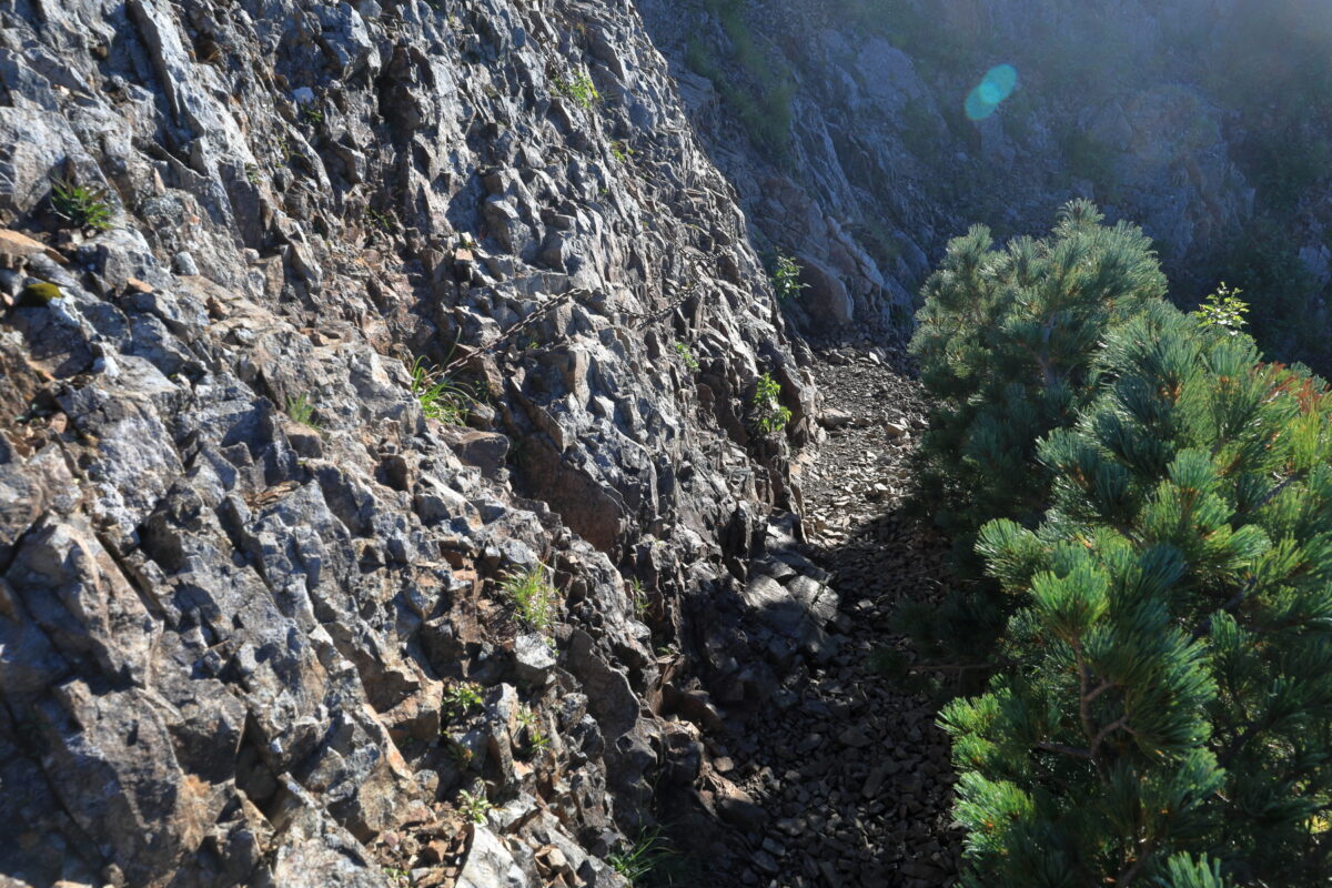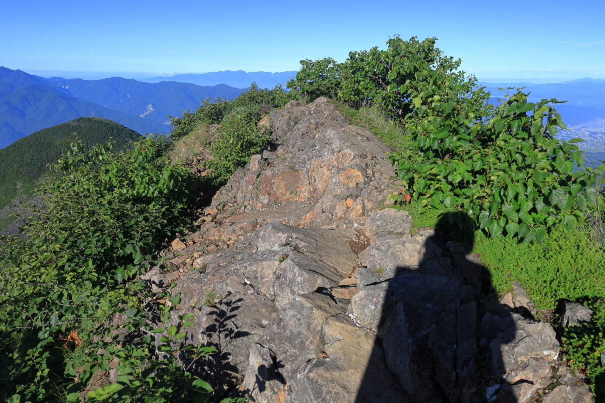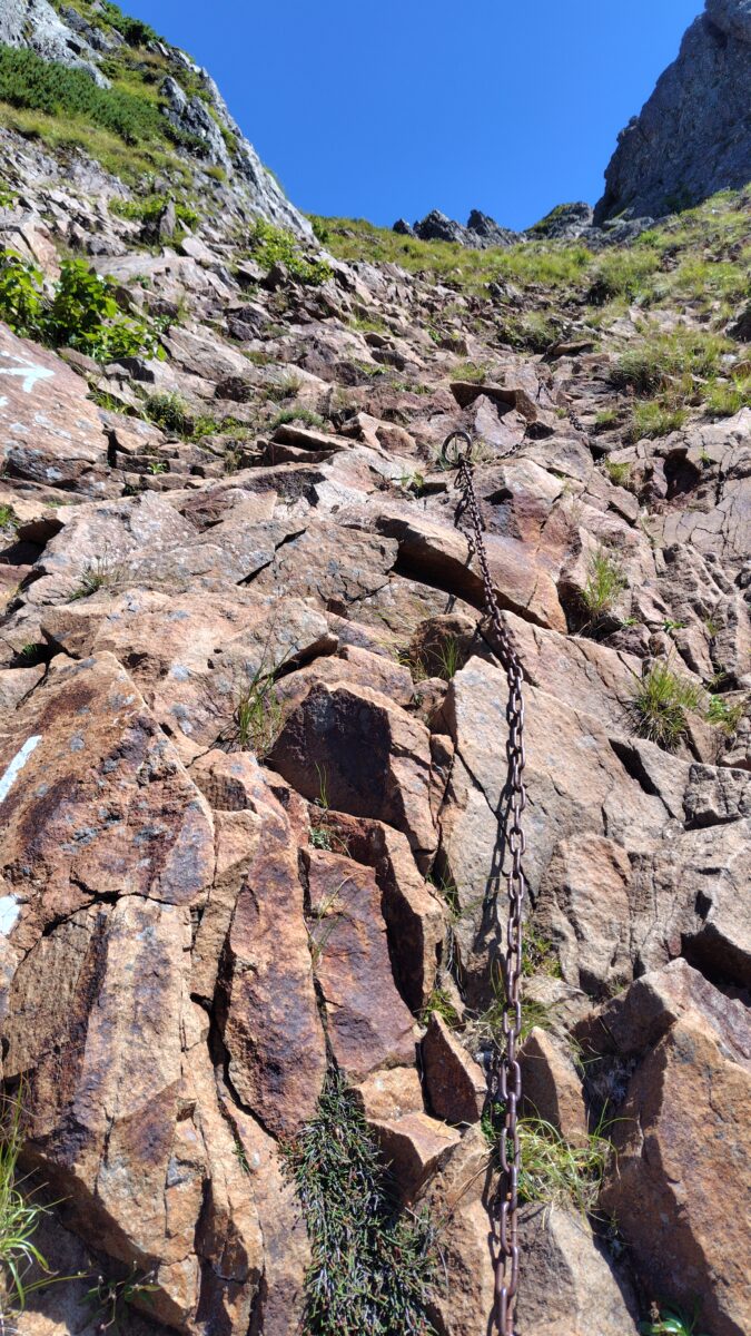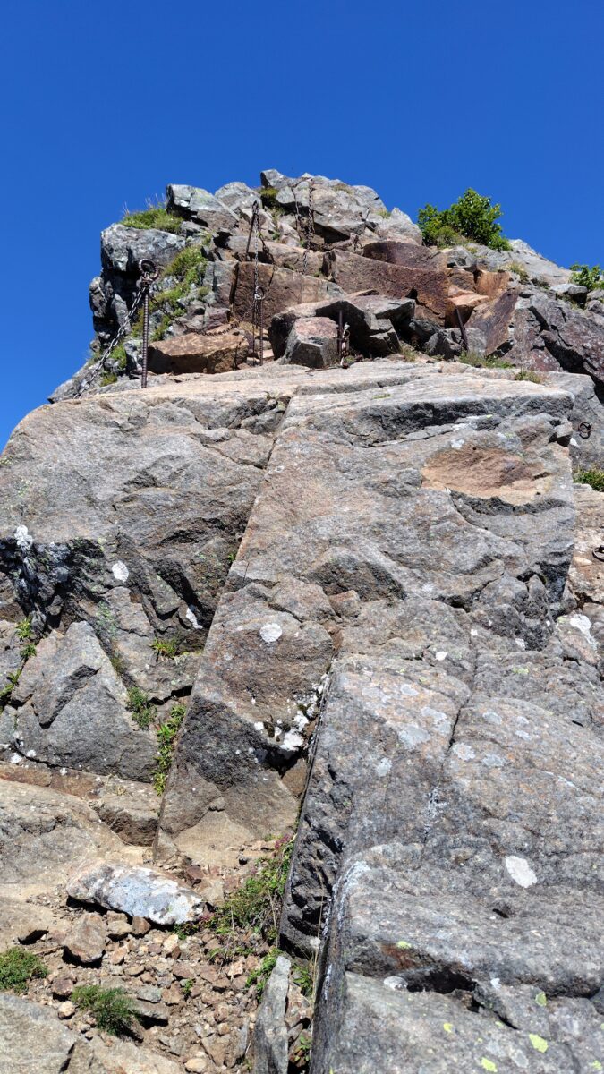 ガレ場・岩場ゾーンを登り終えたら、今度は大きな岩と鎖場。痩せ尾根のようなところに鎖場があるので、慎重に登っていきます。