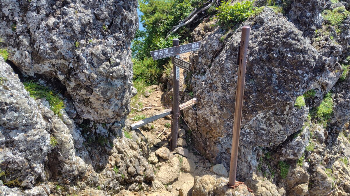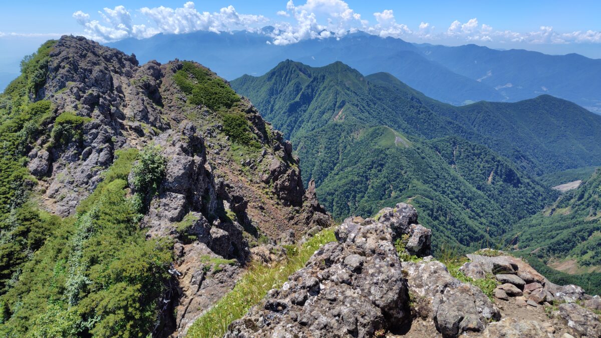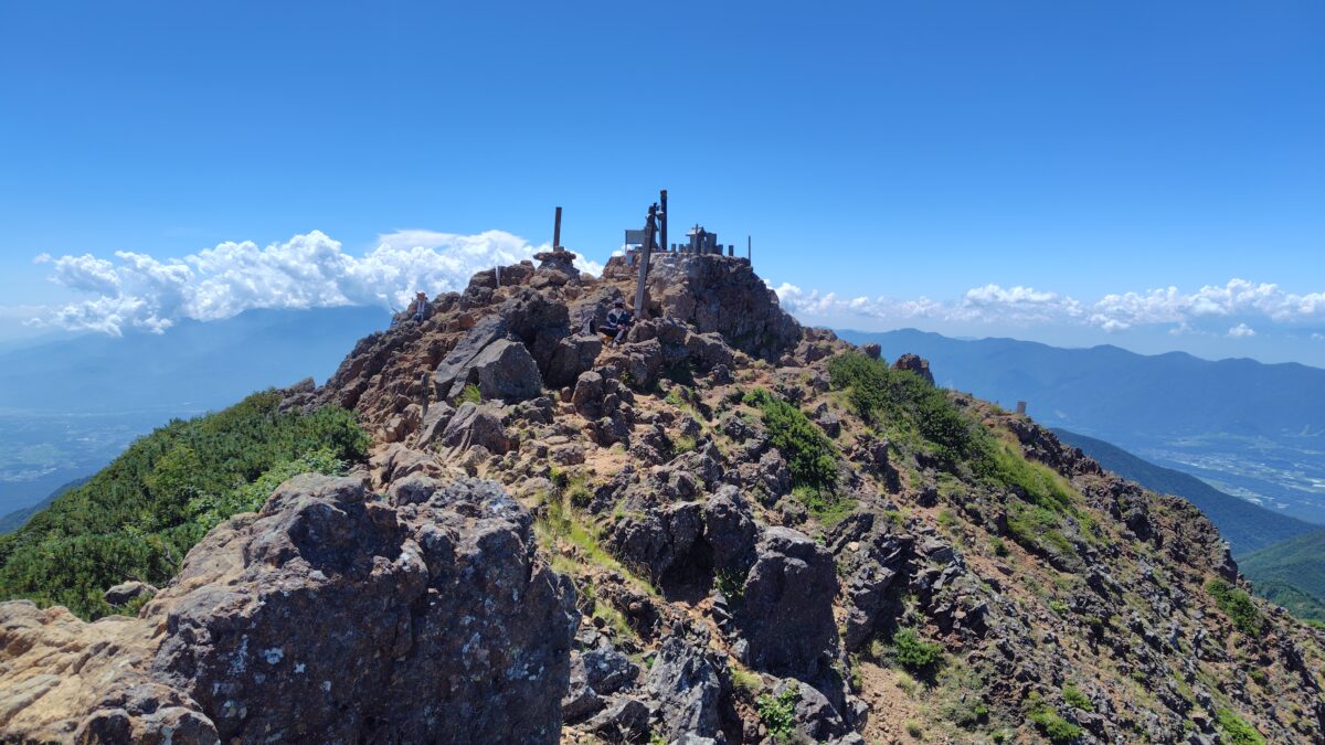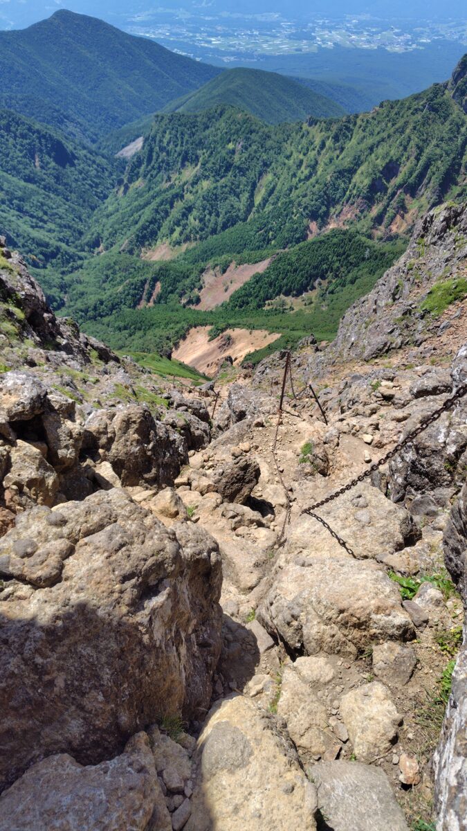 ガレ場・岩場ゾーンを登り終えたら、今度は大きな岩と鎖場。痩せ尾根のようなところに鎖場があるので、慎重に登っていきます。