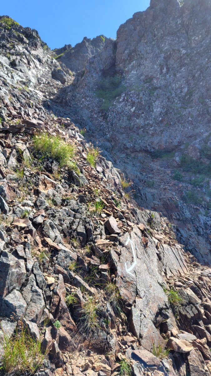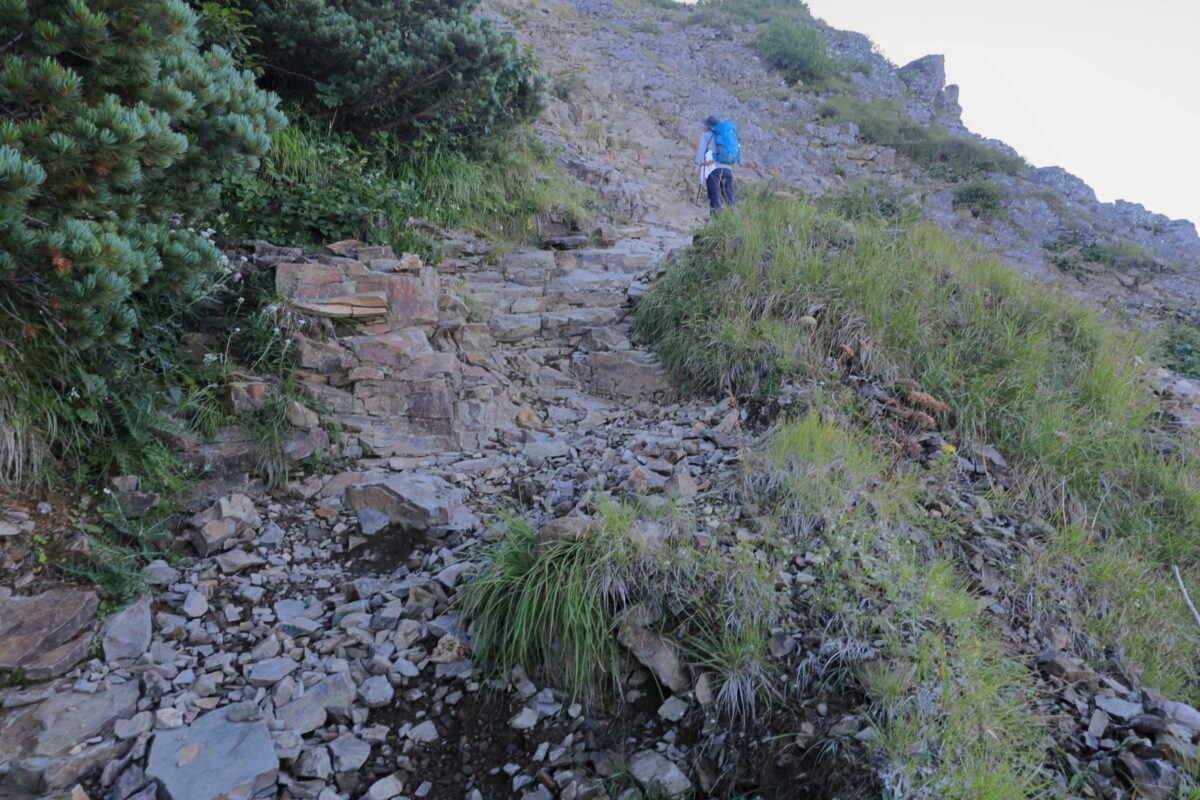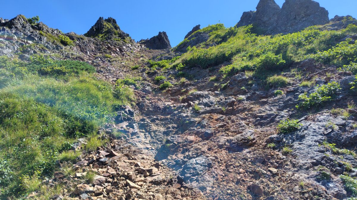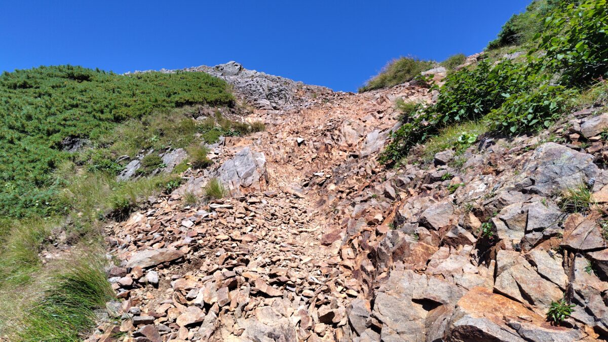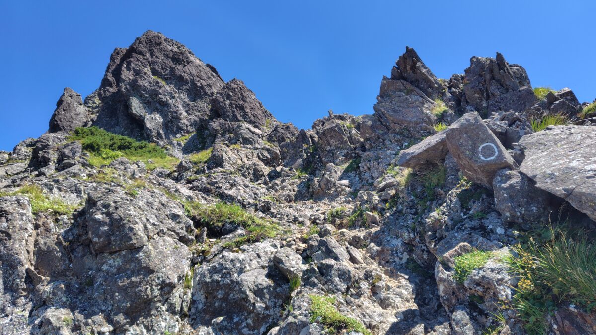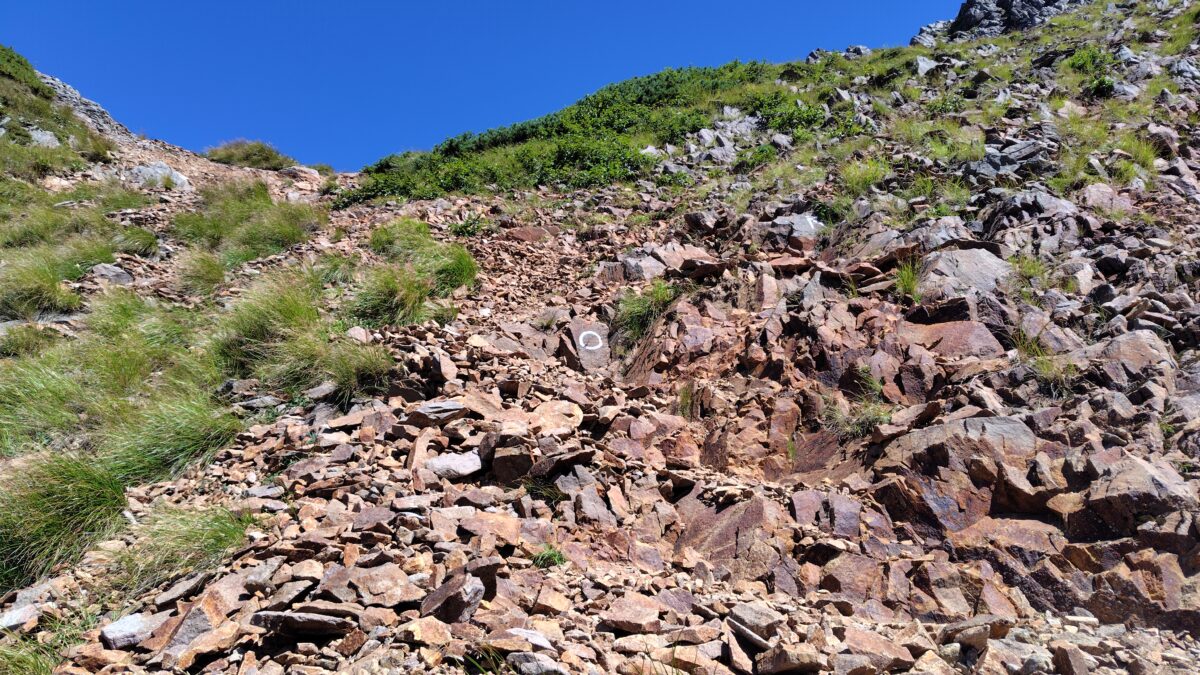 道がわかりづらいところはありますが、白いペンキの目印を探していけば何とかなりました。ただ、荒天の場合は道迷いには注意ですね。気を付けなくてはいけないのは落石です。ガレ気味で石が多いうえに、踏み跡があるところでも浮石がとても多く、かなり注意を要します。自分が落とさないように気をつけるのはもちろんのこと、上を歩いている人がいる場合は、そちらにも気を使いそうです。