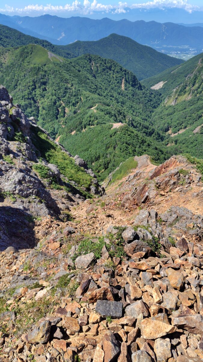 岩場と、このようなガレガレの道が交互に続きます。滑落を警戒するようなところは多くありませんが、浮石がとても多いので、落石には要注意です。今回は前後に誰もいなかったので良かったですが、人が多いときは本当に気を使いそうです。