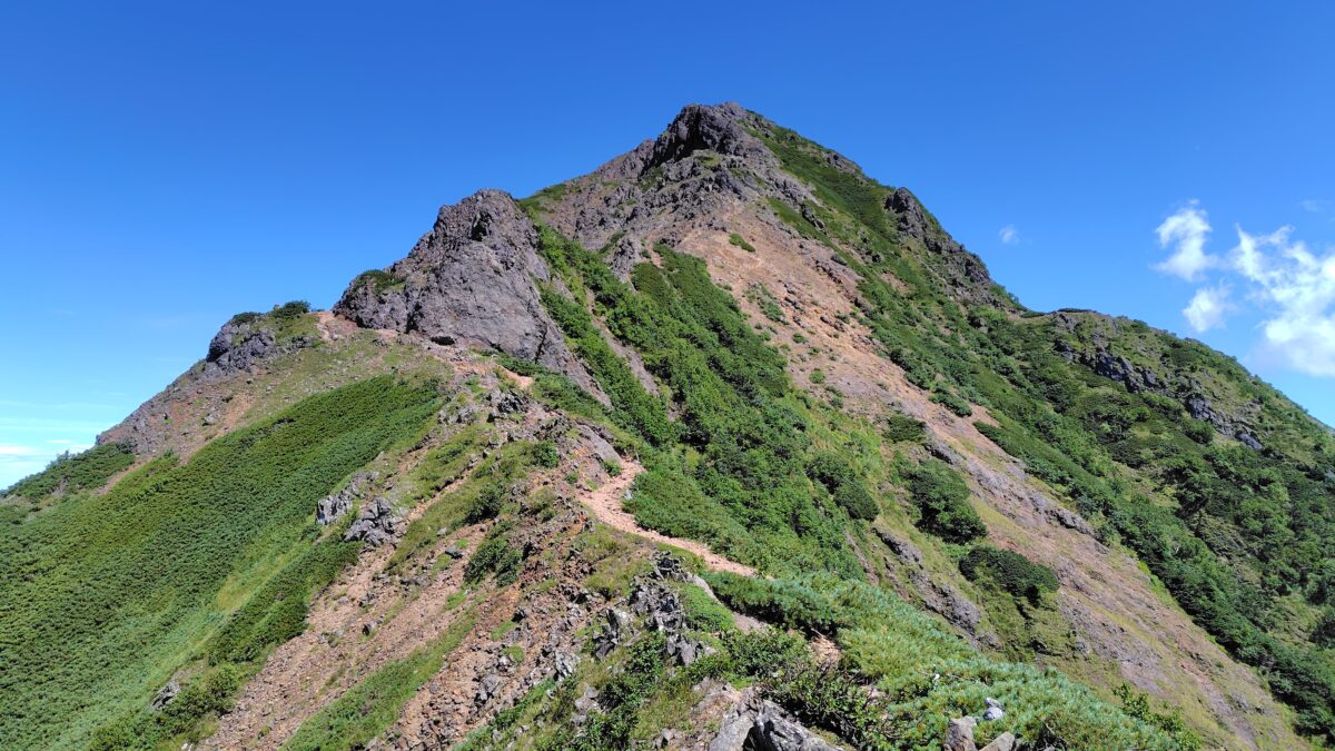 歩いてきた方向を振り返ると、先ほど超えてきた旭岳が聳え立っています。こんなに険しい山だったんですね。