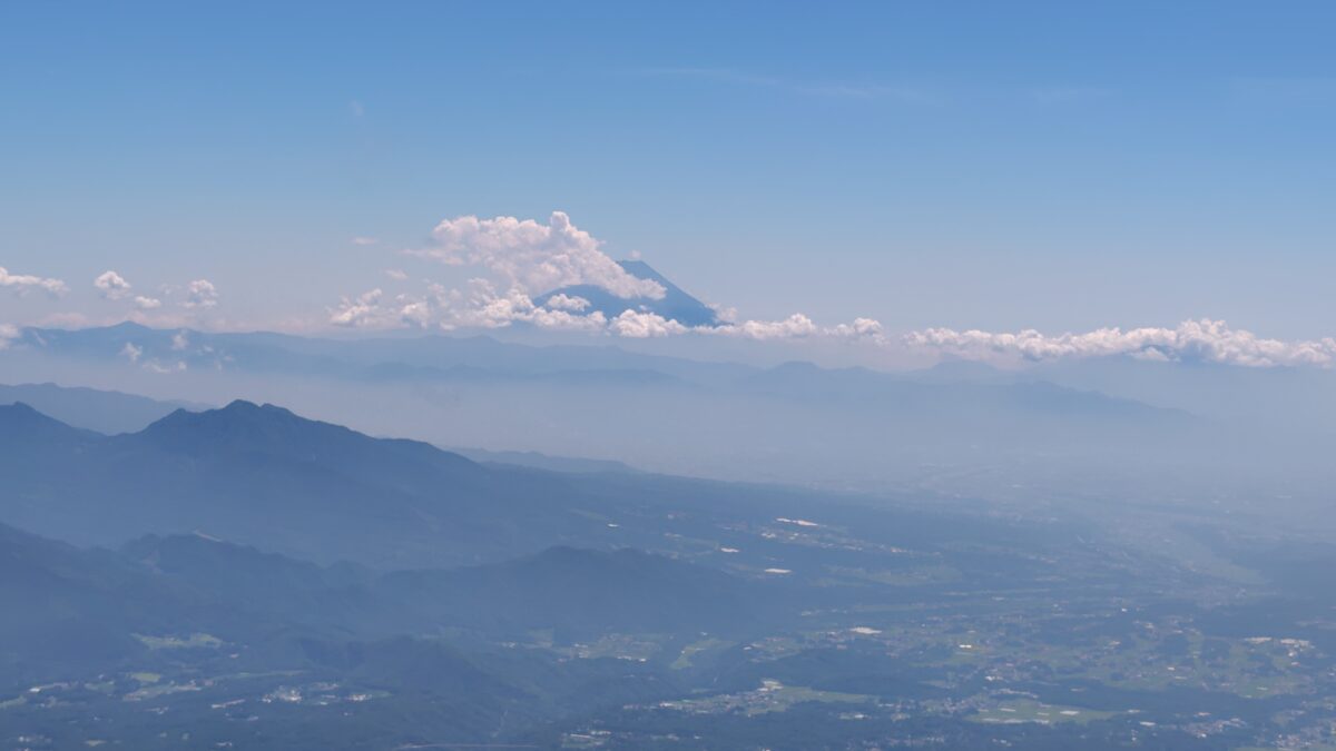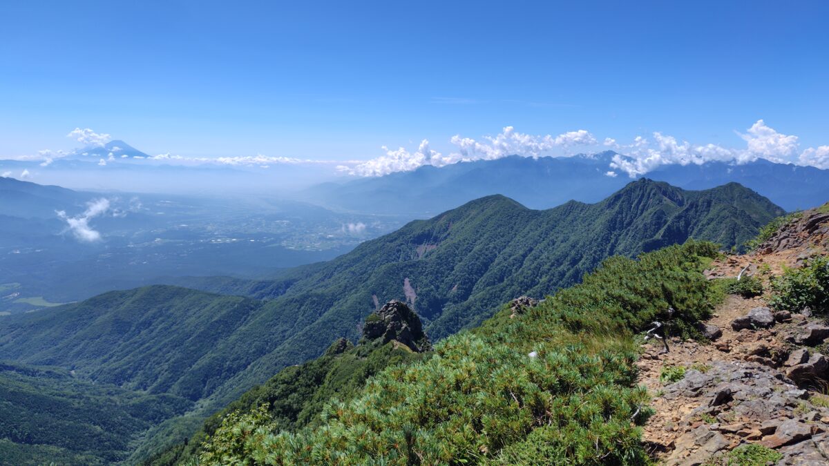 休憩がてら振り返ると、素晴らしい景色! 南アルプスの稜線には少し雲が湧いてきましたが、八ヶ岳の山々はまだ雲がかかっていません。雲海は消えてしまいましたが、富士山はまだくっきり!