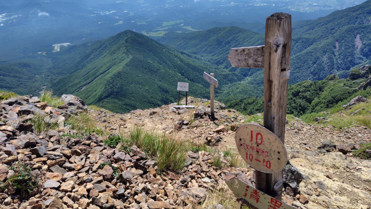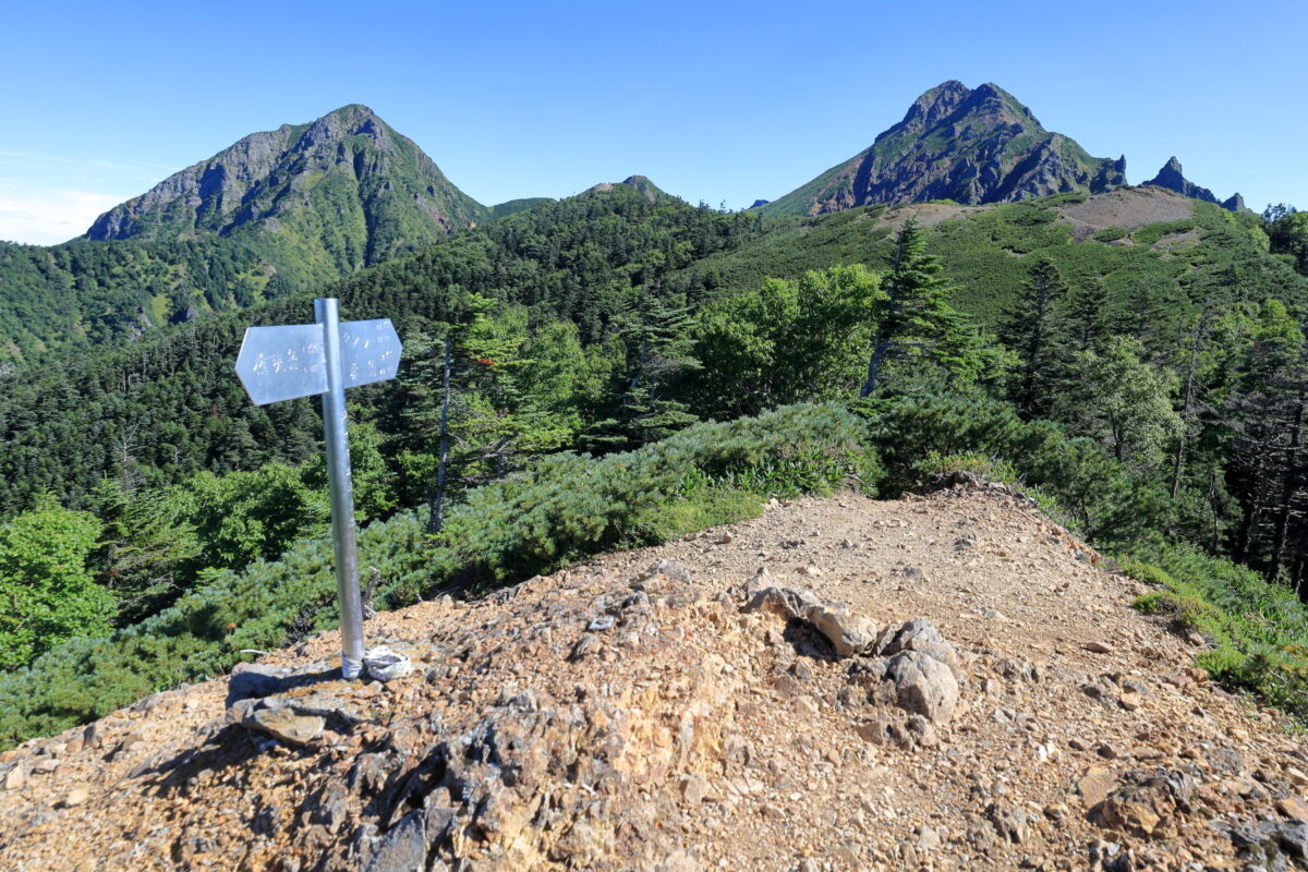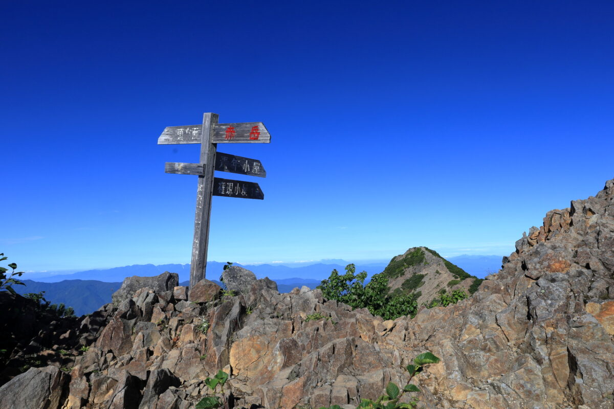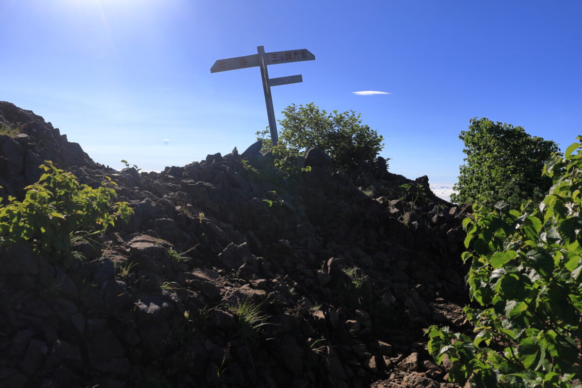 どれが山頂だかよくわかりませんが、目印のあるところを進んでいきます。できるだけ軽量化したとはいえ、テント泊装備でこの急登は堪えます。