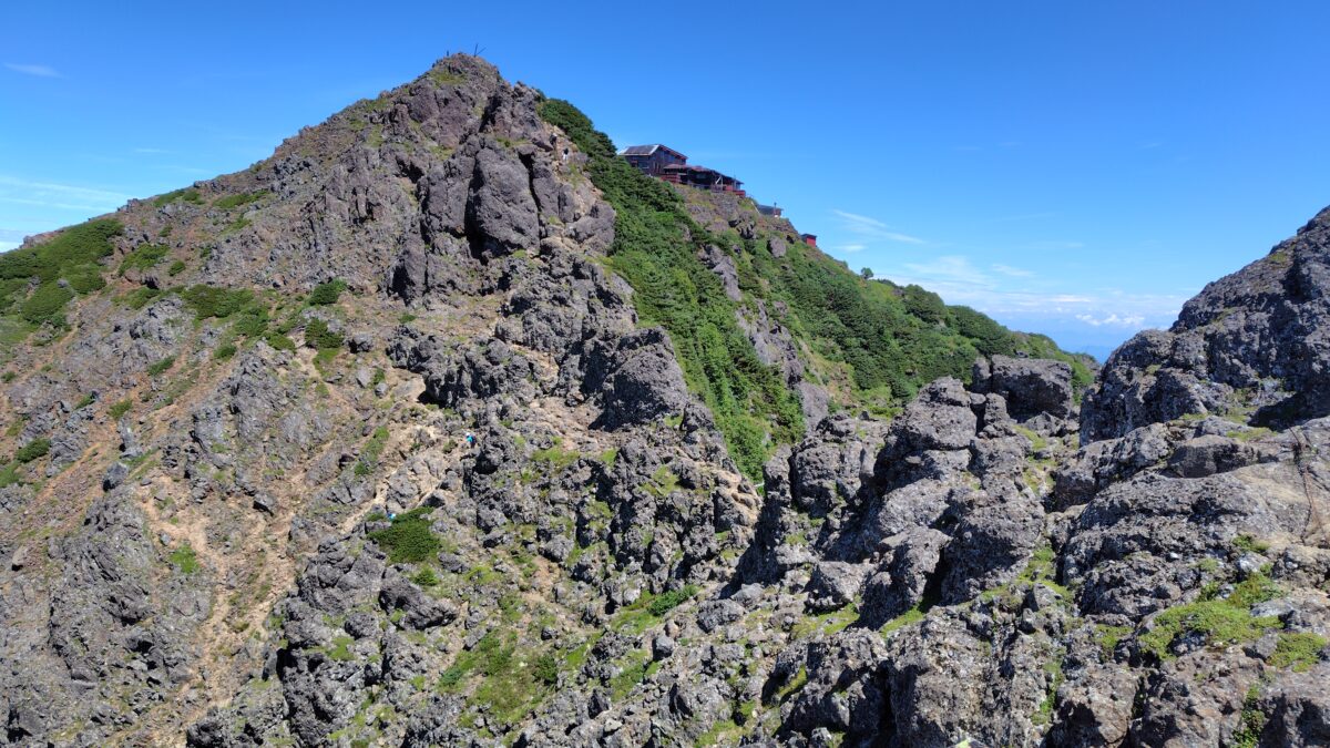 のろし場から先は、森林限界を超えて、岩場が多くなります。このあとのキレット越えもあるので、テント場からヘルメットを着用してきました。