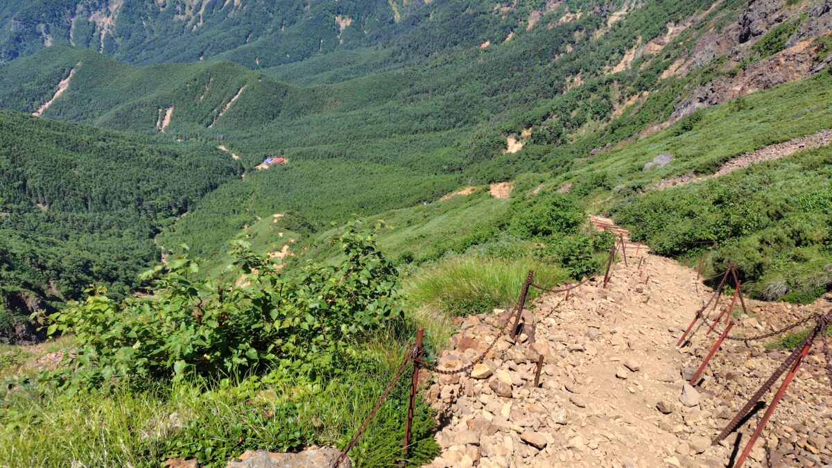 旭岳からの下りです。こちらもなかなかの傾斜! 慎重に下ります。ここからしばらくは、ハイマツに覆われた道が続きます。足元が見づらいのと、ザックの横に外付けしたマットが引っかかって、なかなか大変です。笹などに比べると、ハイマツは固いので、やっかいですね……。