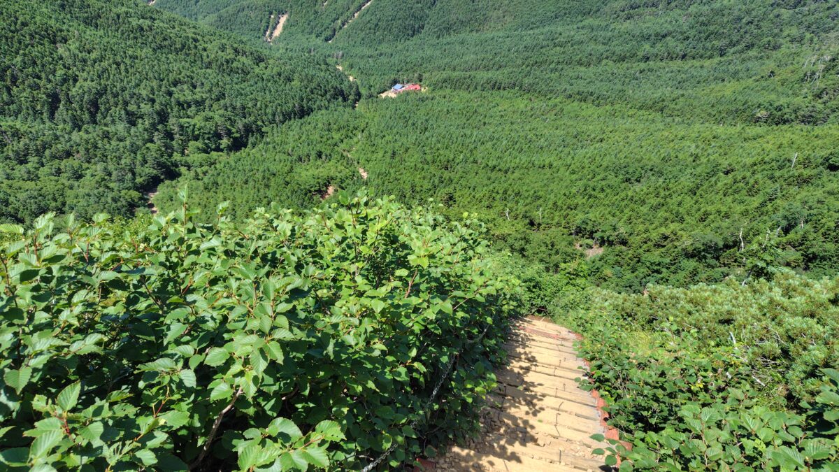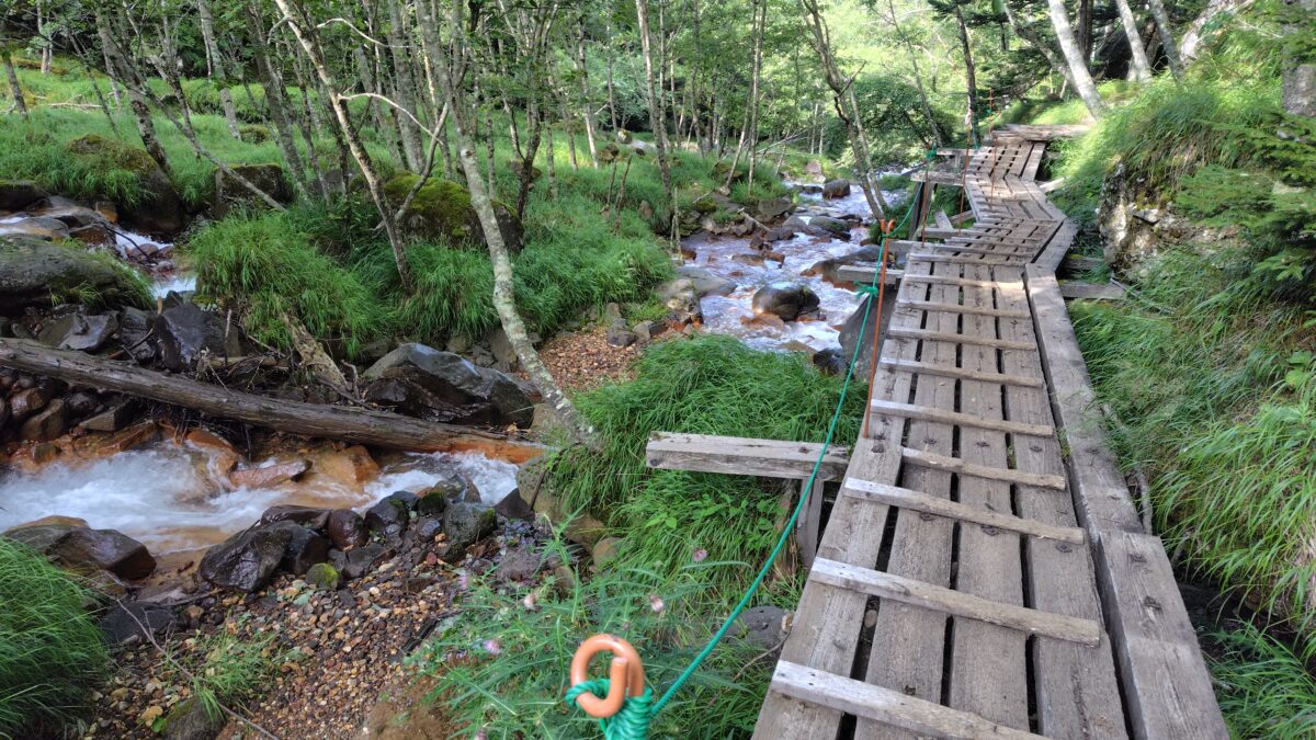 しばらくザレ気味の急坂を下って、ようやく歩きやすい木の階段へ。眼下に行者小屋が近づいてきました。