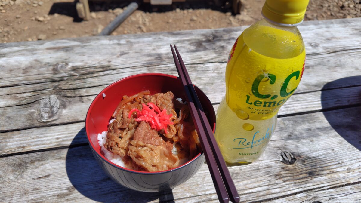 その前に、おなかが空いたので、行者小屋で牛丼とCCレモンを購入。しばしランチ休憩を取りました。