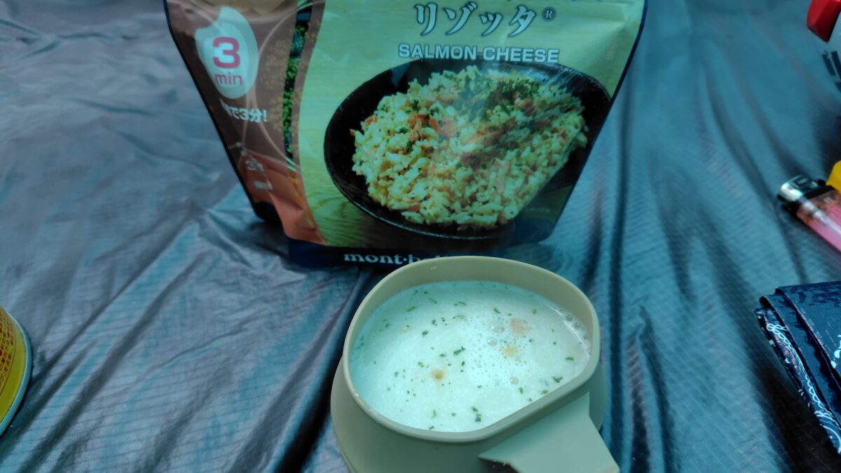 テント内で軽めの朝食。8月とはいえ、朝は冷えるので、温かいスープがおいしいです。