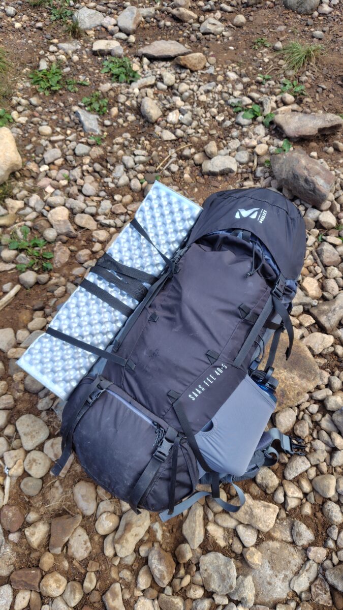 シュラフは、今年購入した夏山用のモンベルの#5を利用。こちらも、まったく問題ありませんでした。軽量でコンパクトになるので、40リットルのザックにも収まります。今後、夏山のテント泊はこのスタイルになりそうです。