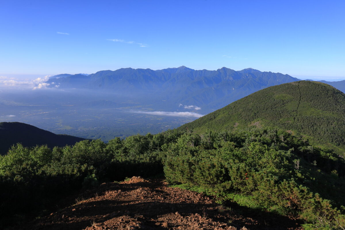 森林限界を超えて開けたところにある広場が「のろし場」。南側には、昨日は雲がかかっていた南アルプスがバッチリ見えていました。右側に見える山は編笠山です。もう、編笠山と同じくらいの高さまで登ってきていますね。