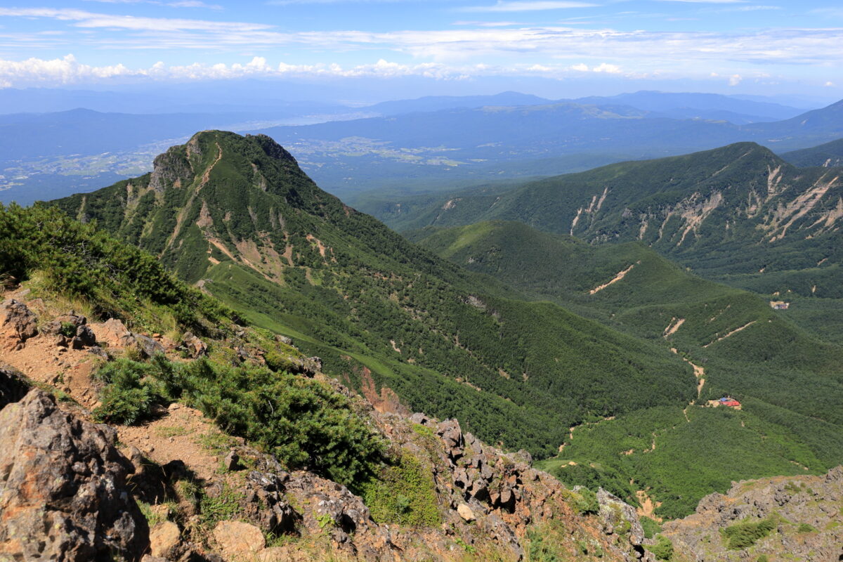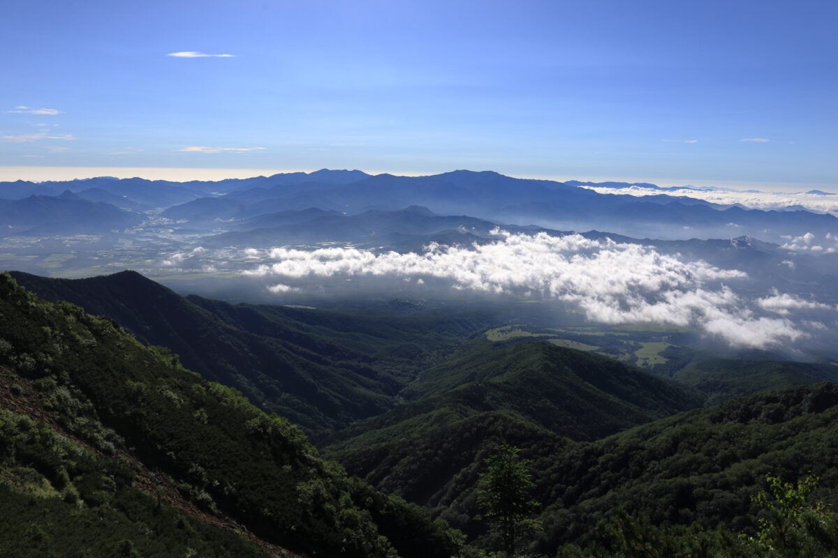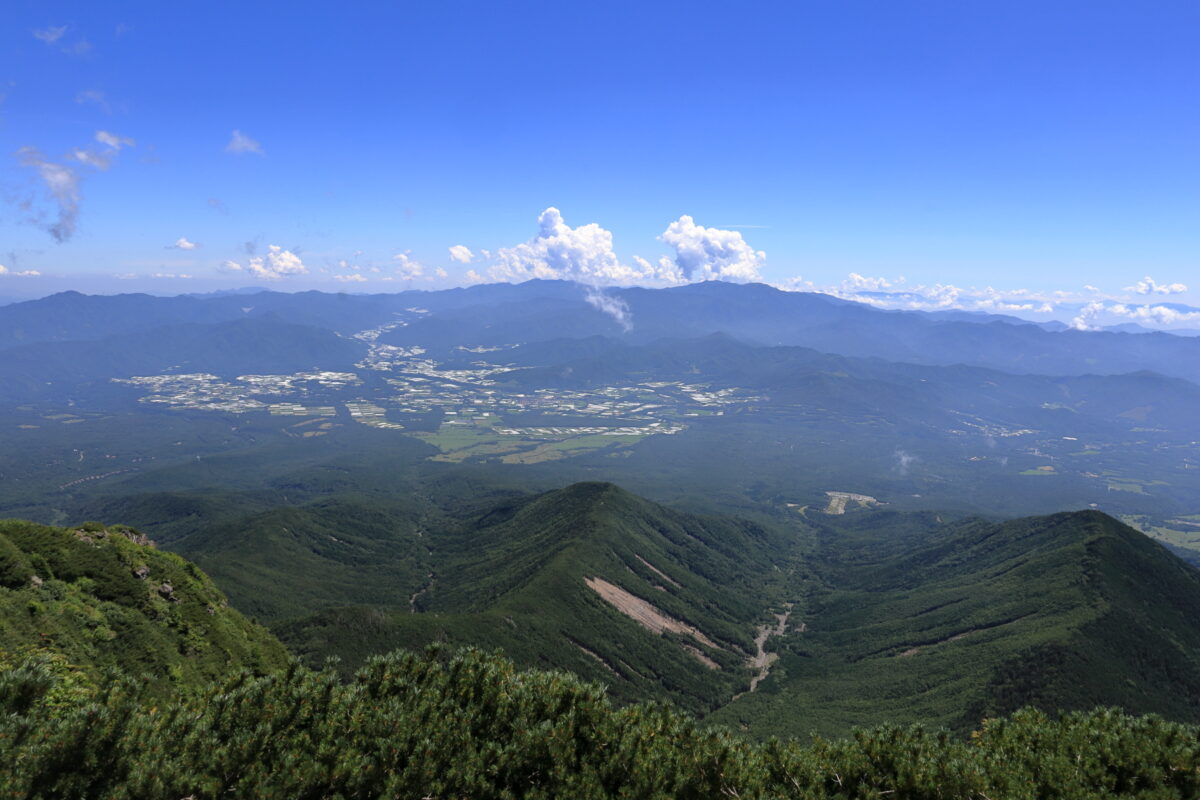 赤岳山頂で記念撮影をしたあとは、腰を下ろして、ゆっくり景色を楽しみます。東側は野辺山高原と、その奥に奥秩父山塊。野辺山高原には高原野菜の畑が見えますね。