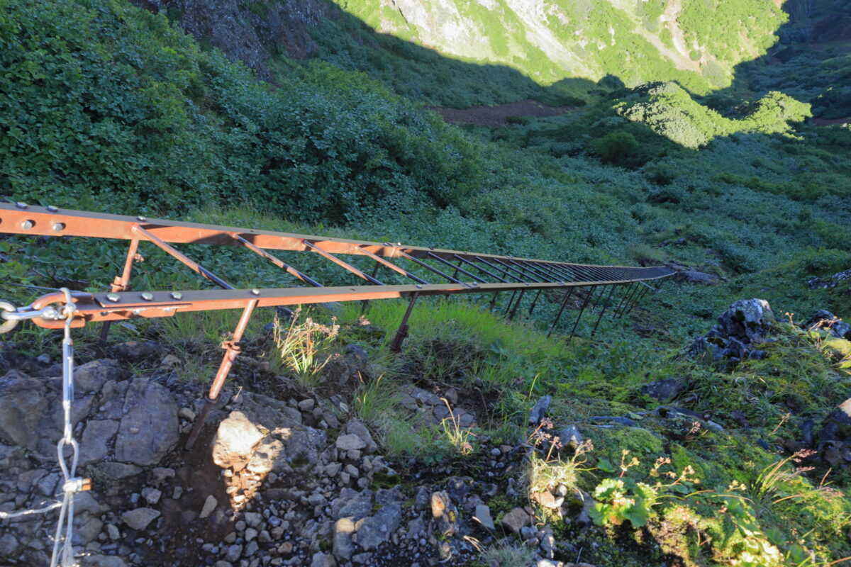 すぐに、キレット名物の長いハシゴがあります。これを下ります。垂直に見えますが、少し斜めになっています。それでも、とにかく長いので、高度感はすごいですね。慎重に下ります。